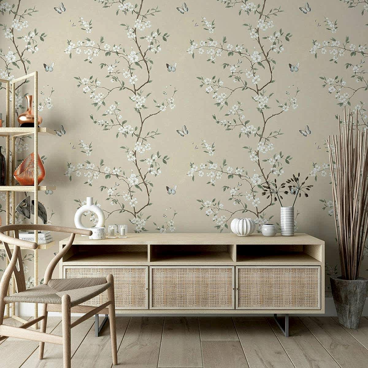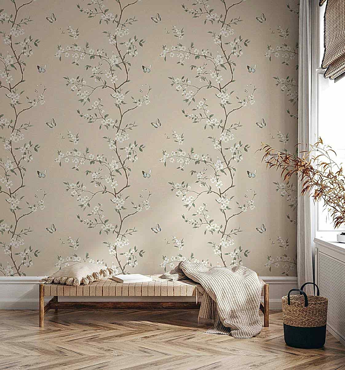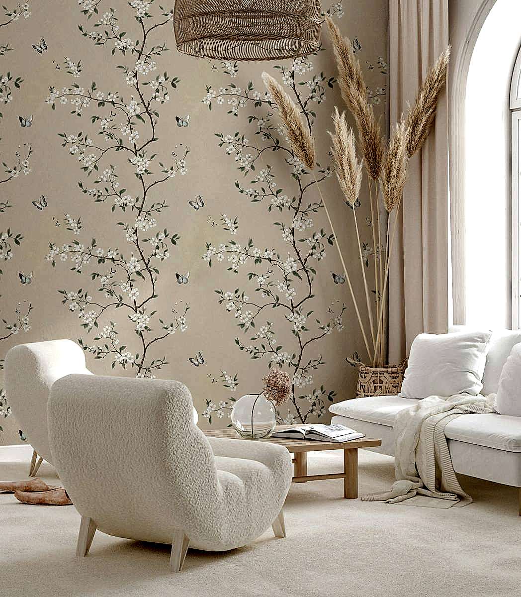 Bej Arka Plan Üzerinde Kelebekler Minimalist Çiçek Tasarımlı Narin Çiçek Duvar Kağıdı