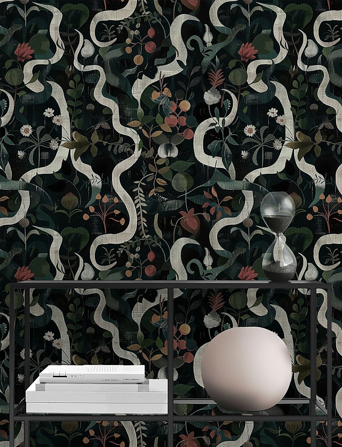 Botanik Çiçekli Duvar Kağıdı – Koyu Arka Plan, El Çizimi Çiçekler, Yapraklar, Meyveler ve Dalgalı Çizgiler