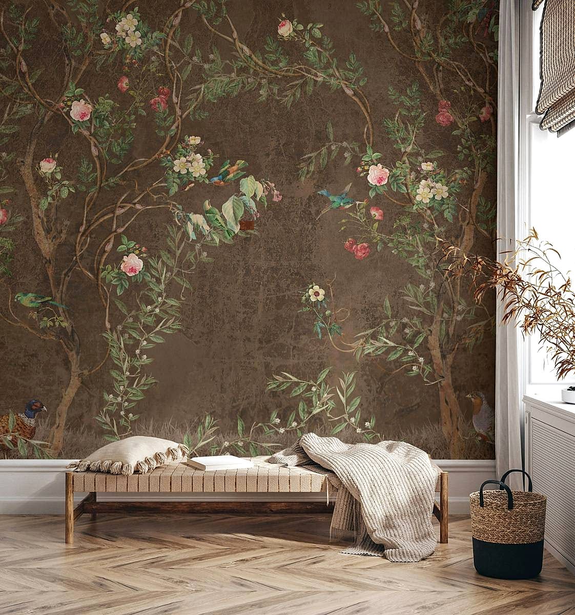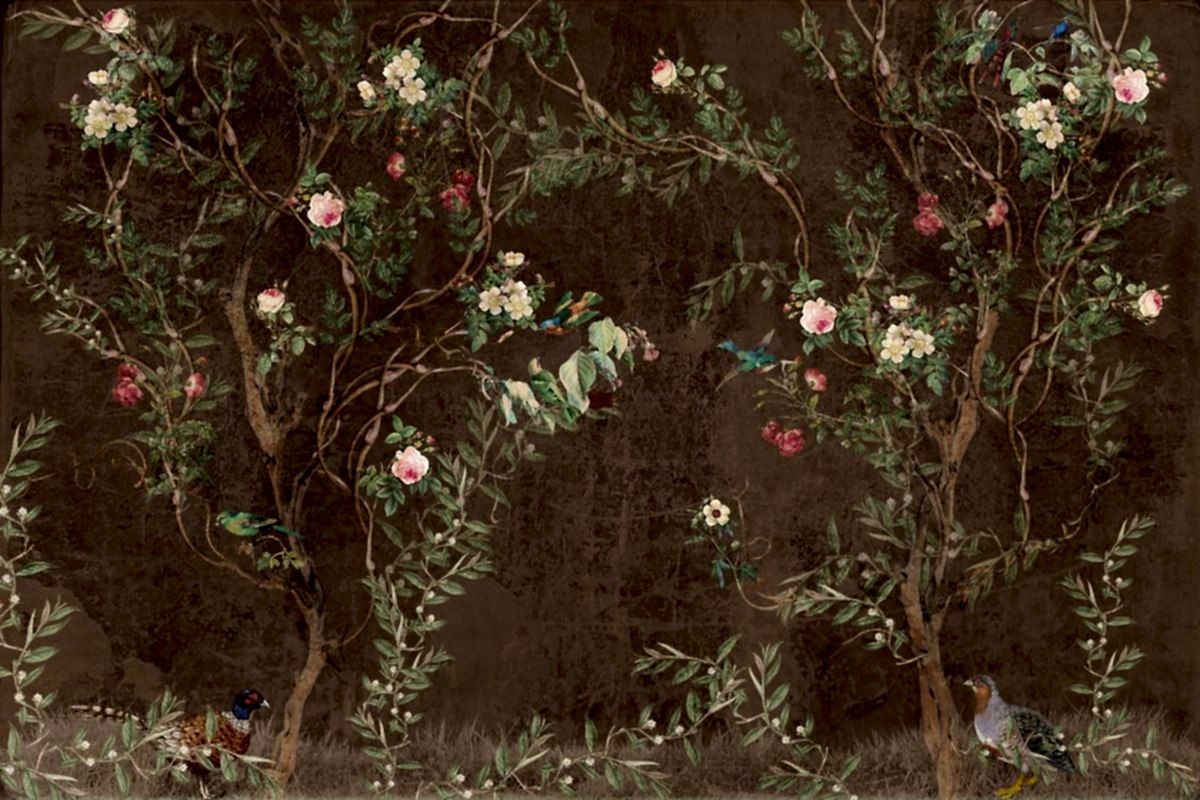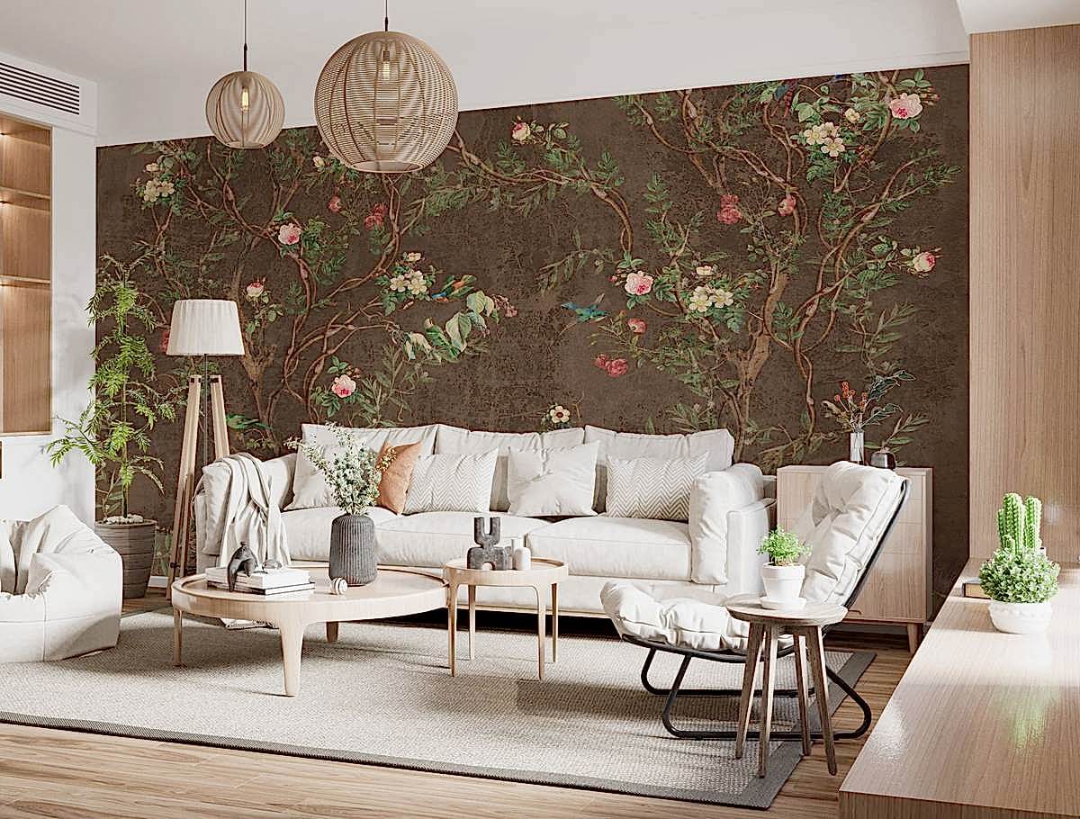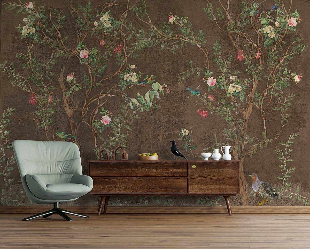 Kahverengi zemin üzerine işlenmiş bu Chinoiserie tarzı duvar kağıdı, zarif kuş figürleri ve detaylı çiçek desenleriyle klasik doğu estetiğini modern dekorasyonla buluşturuyor. Zengin arka plan rengi sayesinde hem sıcak hem de sofistike bir atmosfer yaratır. Özellikle geleneksel veya rustik tarzda dekore edilmiş alanlarda etkileyici bir odak noktası oluşturur. Oturma odası, yemek alanı ya da özel projeler için şık bir seçimdir.