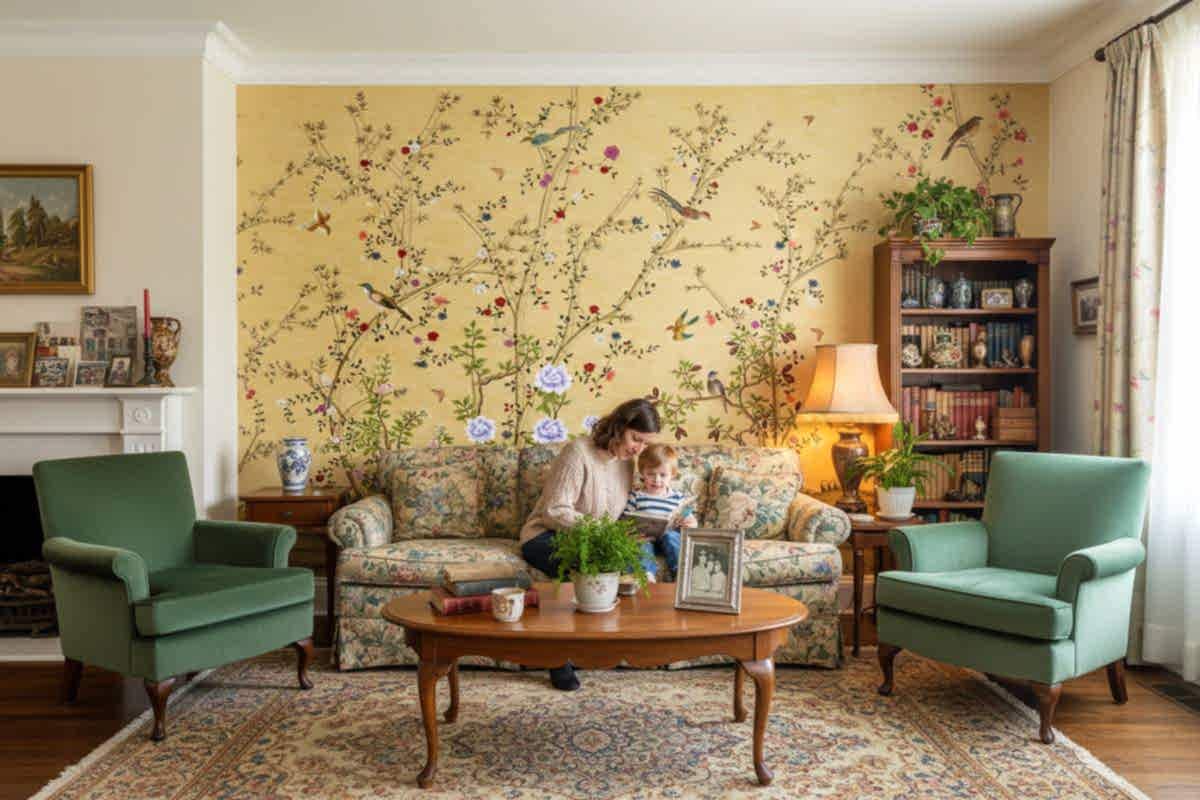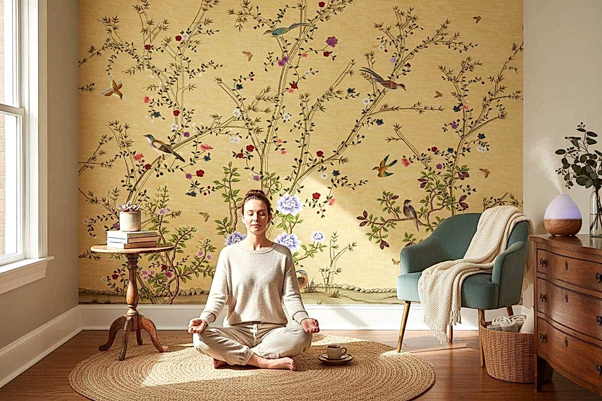 Bu duvar kağıdı, zarif chinoiserie stili ile bej, yeşil, kırmızı, mor, mavi ve kahverengi tonlarında çiçekler, kuşlar ve ağaç dallarını içerir. Modern ev dekorasyonu için ideal bir seçimdir.