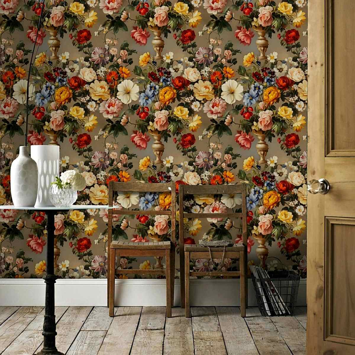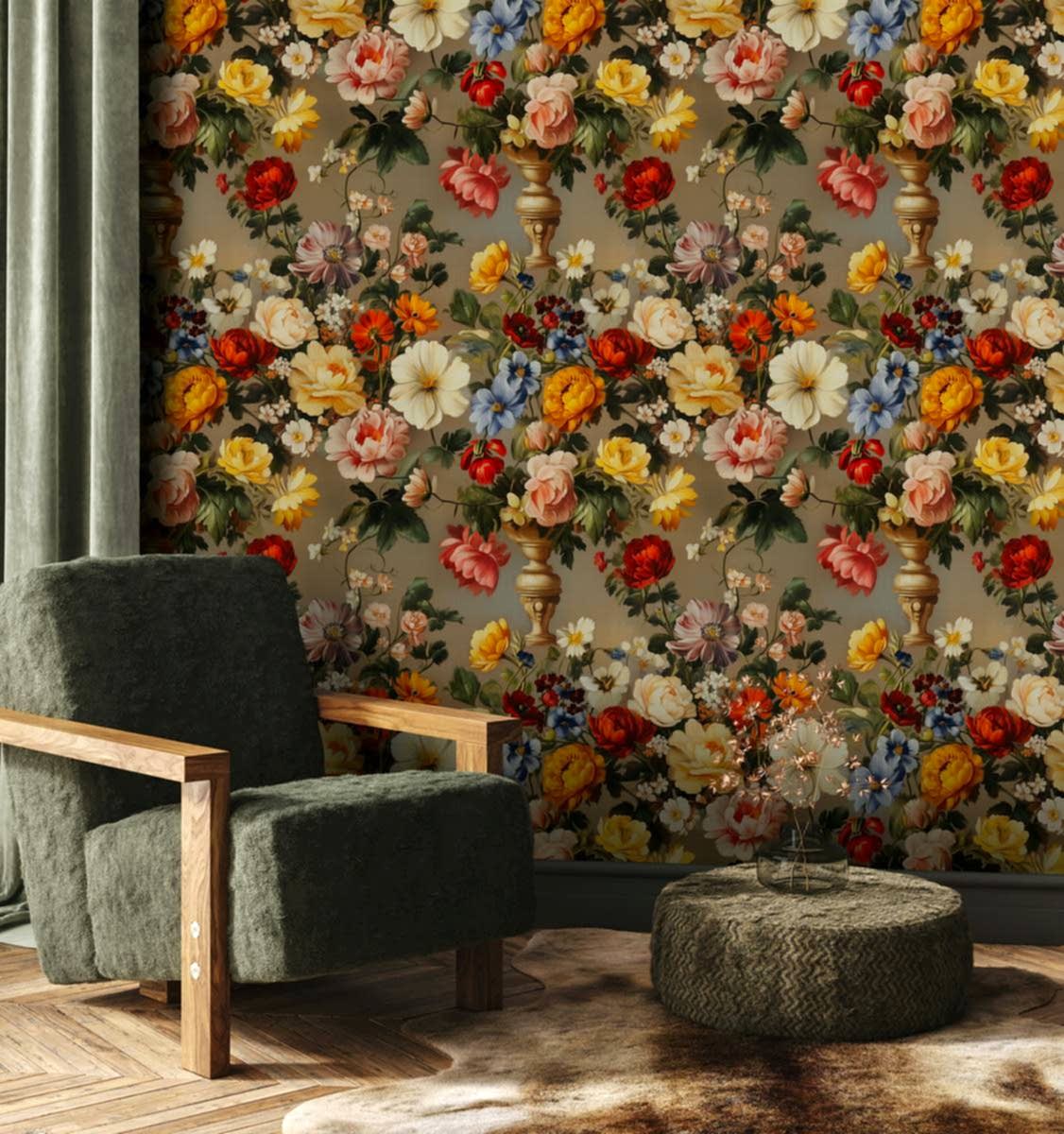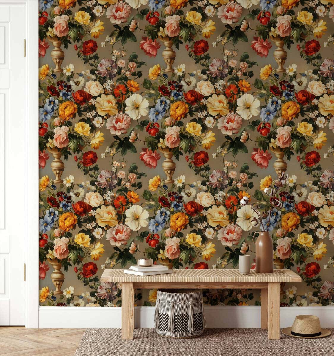 Bu zarif vintage çiçekli duvar kağıdıyla mekanınızı dönüştürün, klasik bir natürmort düzenlemesinde göz alıcı bir dizi renkli çiçek bulunur. Bu yüksek kaliteli duvar resmi, şakayıklar, güller, papatyalar ve daha fazlası dahil olmak üzere çeşitli çiçekleri sergiler, hepsi altın bir vazoda ustaca düzenlenmiştir. Zengin, sıcak renk paleti ve ayrıntılı resim stili, her oda için mükemmel zamansız, zarif bir atmosfer yaratır. Oturma odalarında, yatak odalarında veya yemek alanlarında bir ifade duvarı oluşturmak için ideal olan bu duvar kağıdı, bir ustanın resminin güzelliğini evinize getirir.