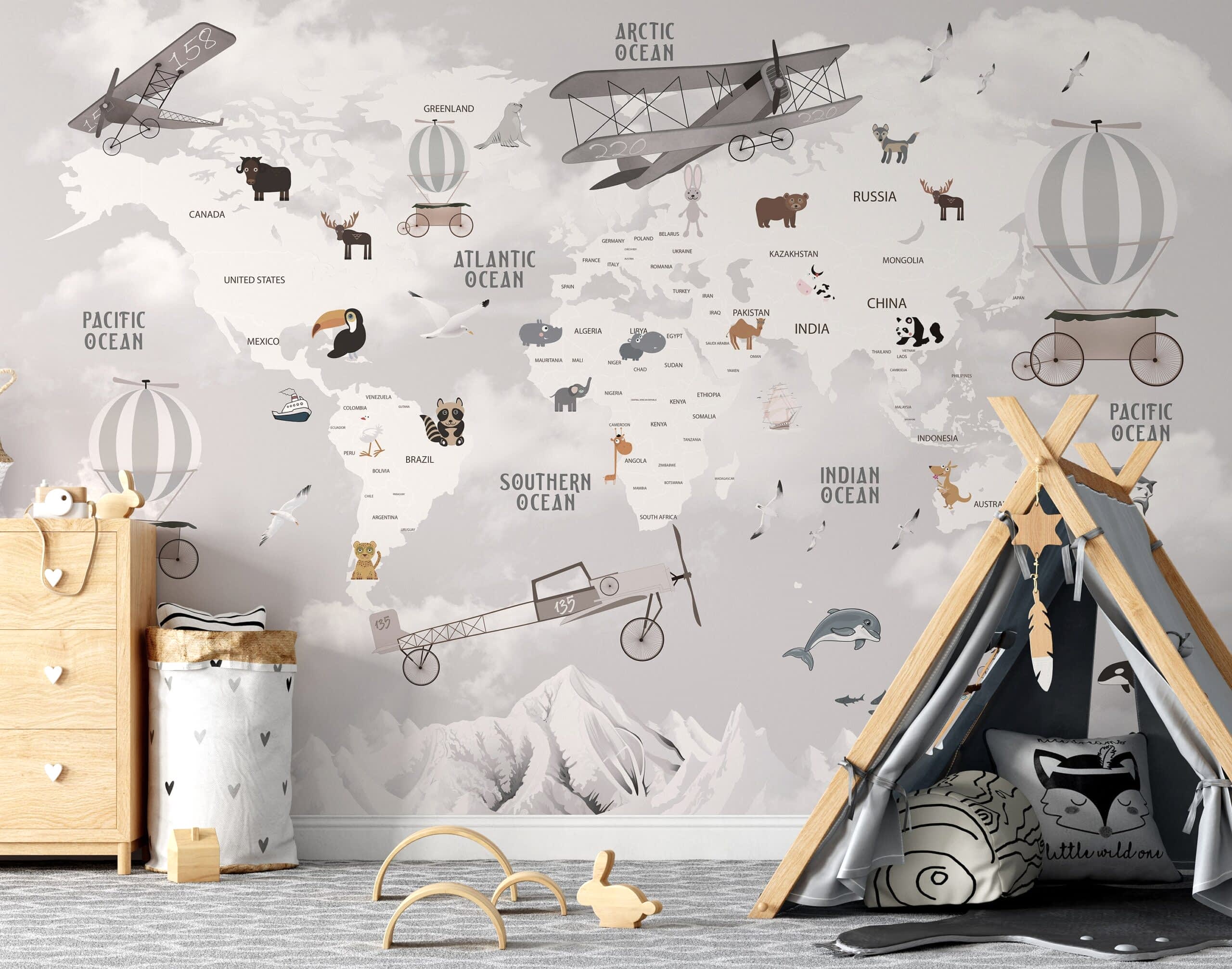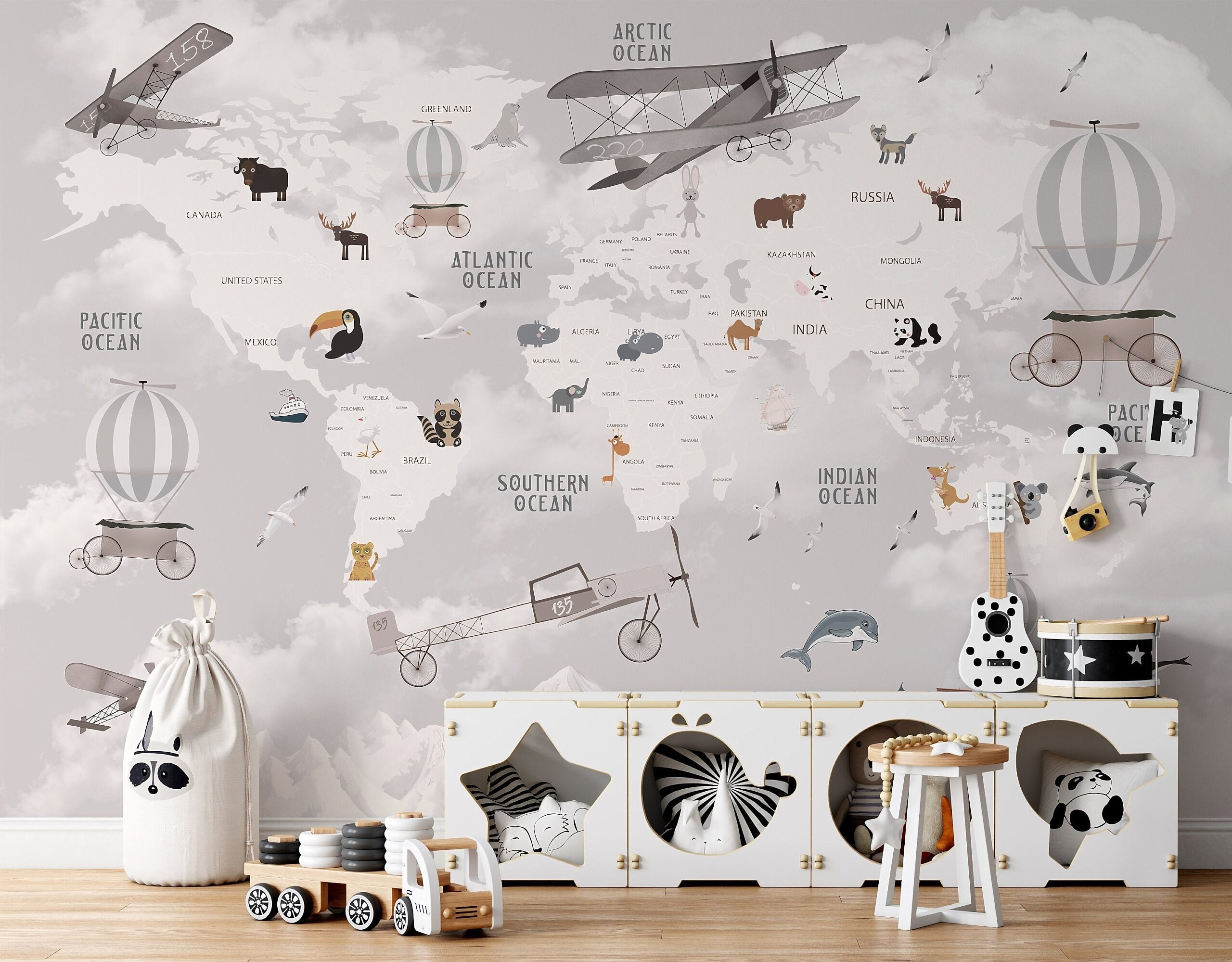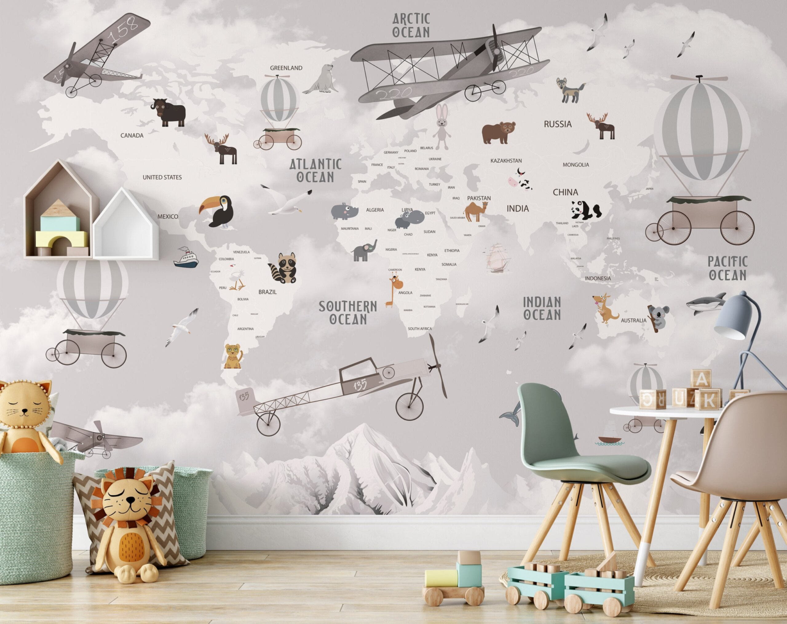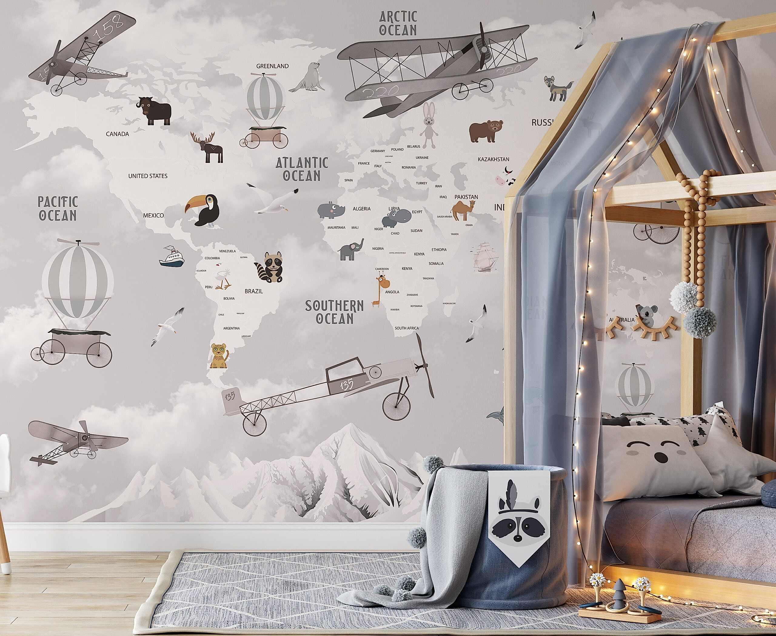 Çocuk Duvar Kağıdı Eski Stil Uçaklar Hayvanlar Dünya Haritası Duvar Kağıdı