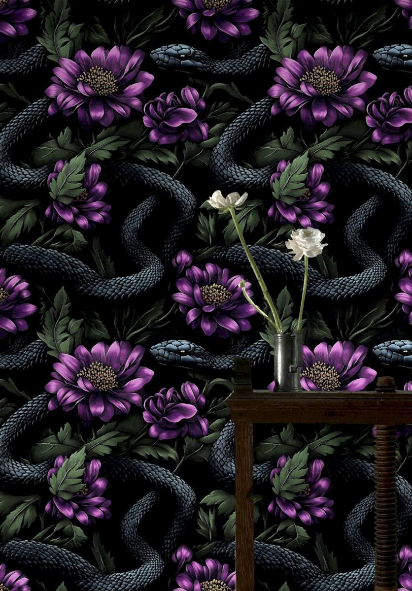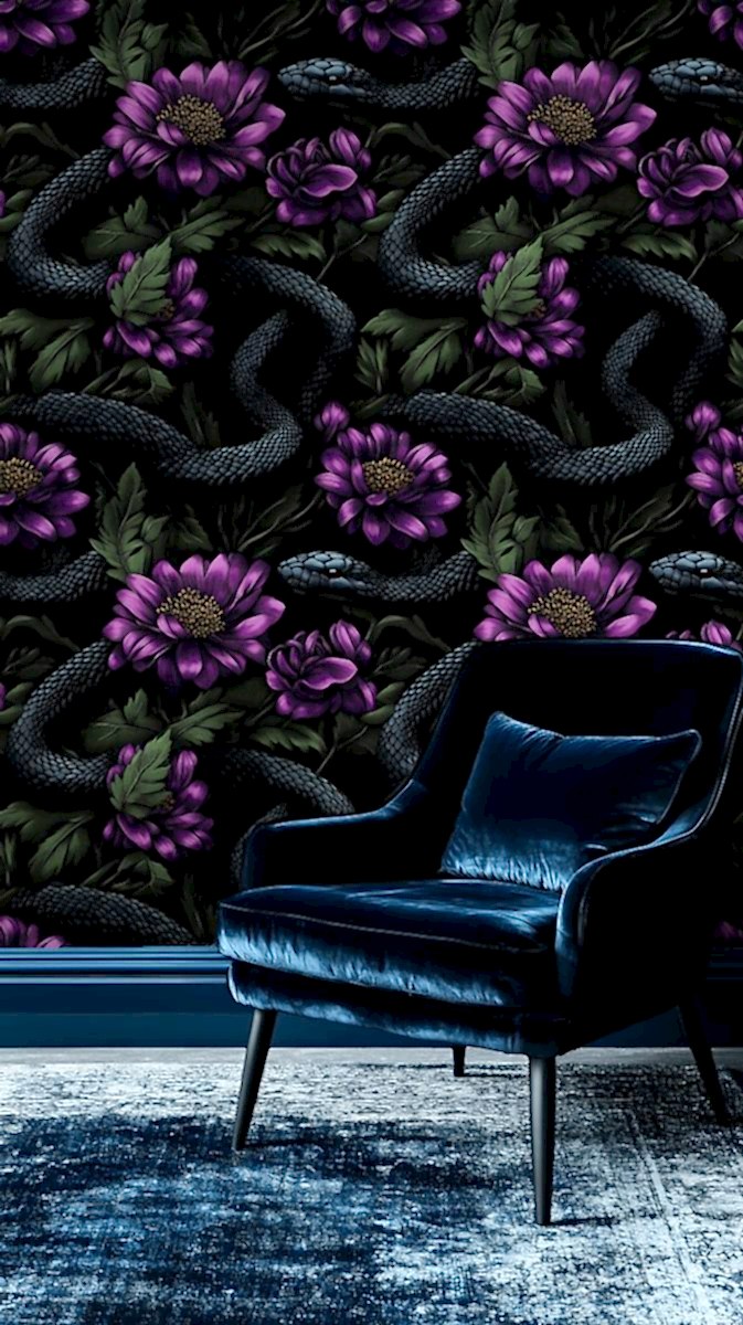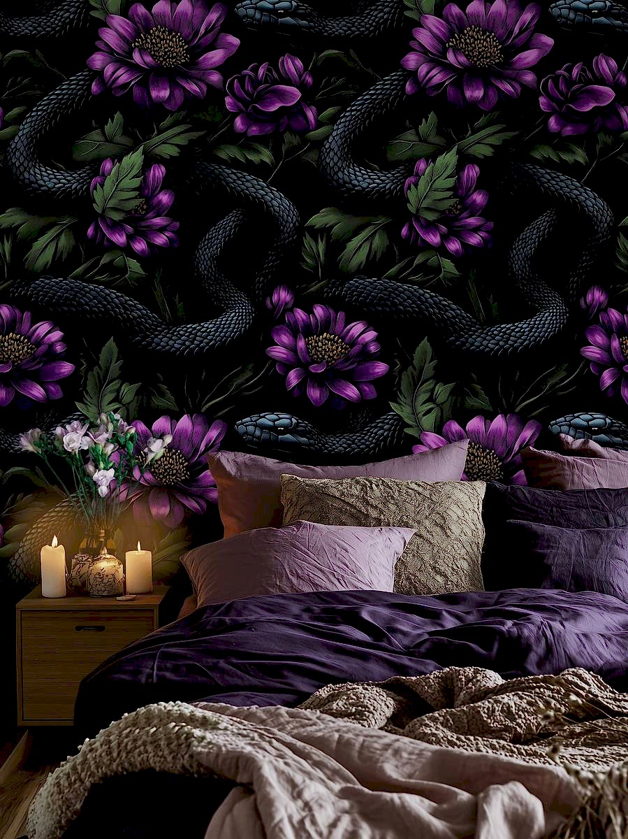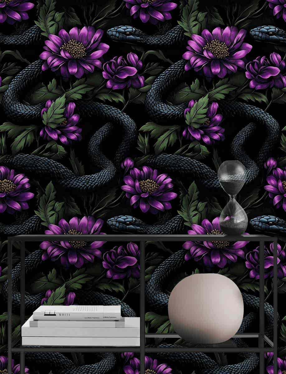 “Gizemli Vahşi Çiçekler” duvar kağıdı, derin siyah zemin üzerinde mor çiçeklerin canlı tonları ve kıvrak yılan figürleriyle cesur ve etkileyici bir tasarım sunuyor. Doğanın güzelliklerini karanlık bir zarafetle buluşturan bu tasarım, mekana gizemli bir atmosfer kazandırırken, sanat eseri hissi uyandırır. Çiçeklerin detaylı dokusu ve yılanın dinamik hareketi, dekorasyonunuzu sıradışı ve çarpıcı bir seviyeye taşır.