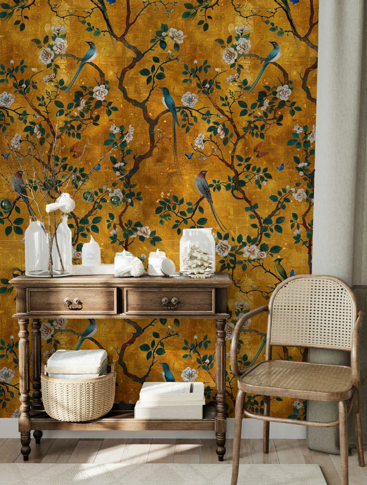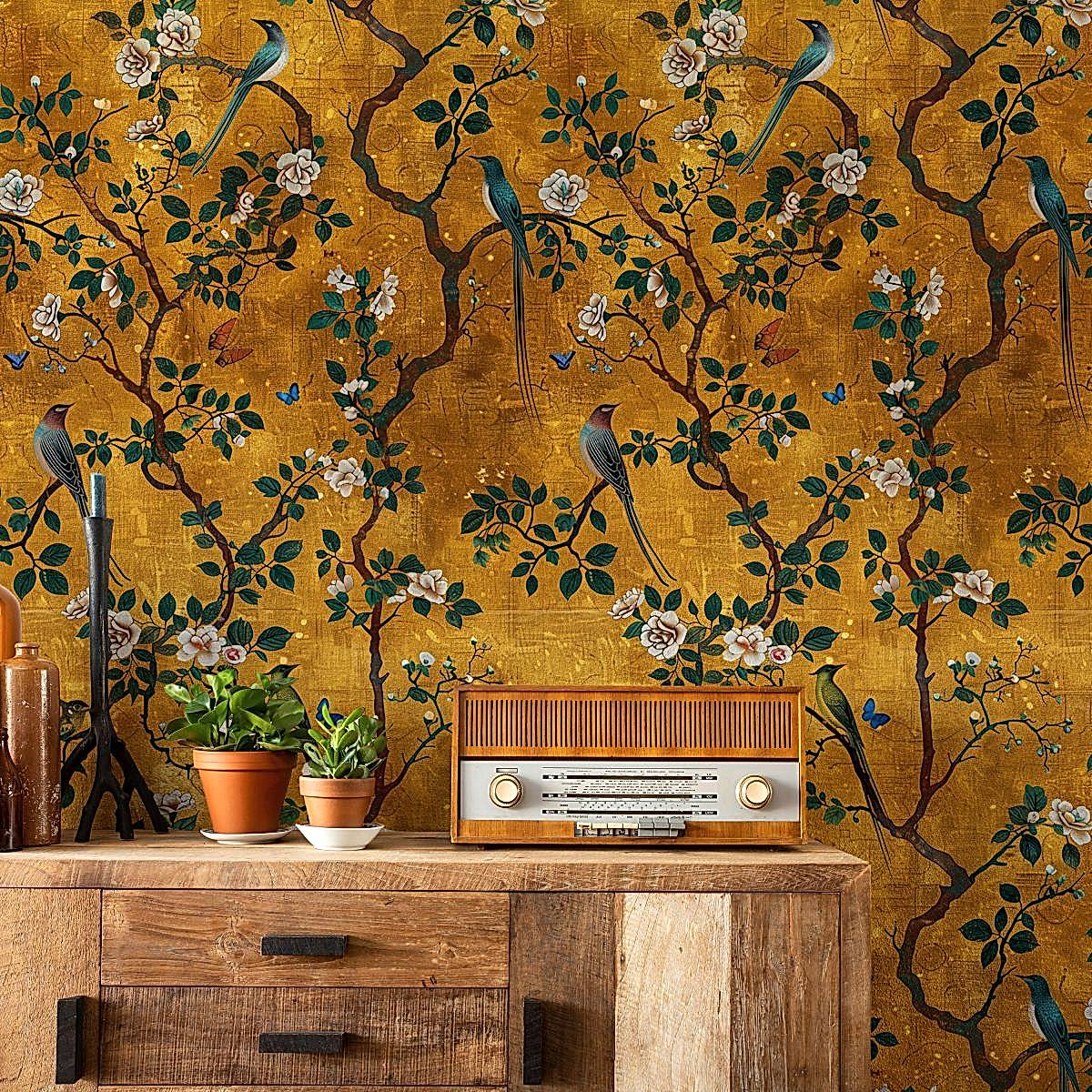 Gold Botanik Kuş Duvar Kağıdı – Kuşlar, Kelebekler ve Dallar ile Vintage Çiçek Deseni Altın Rengi Duvar Posteri