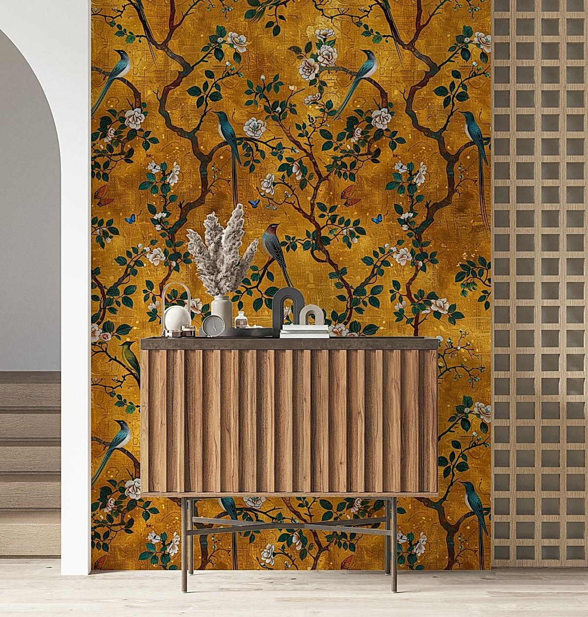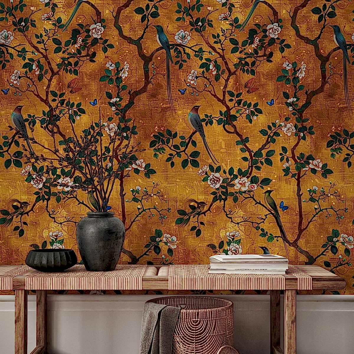 Evinizin dekorunu, zengin altın bir arka plana sahip bu çarpıcı botanik duvar kağıdı ile yükseltin. Bu zarif tasarım, ince beyaz çiçekleri, canlı kelebekleri ve birbirine dolanmış dallarda duran zarif kuşları sergiler. Karmaşık detaylar ve lüks gold renkler, her odaya doğanın ve sanatın dokunuşunu eklemek için mükemmel olan büyüleyici ve sofistike bir görünüm yaratır. Duvar kağıdının el boyaması tarzı ve doğal dokusu, bir sıcaklık ve zarafet hissi getirir, bu da onu oturma odaları, yatak odaları veya vintage cazibe ile modern sofistikasyonu harmanlayan herhangi bir alan için ideal kılar. Bu tasarım, doğanın güzelliklerini zamansız bir estetikle yakalayarak her iç mekanı daha da güzelleştirir.