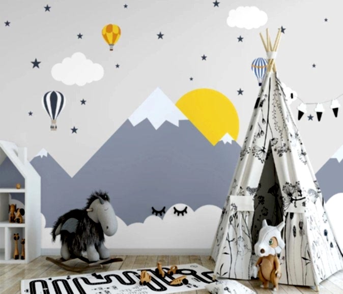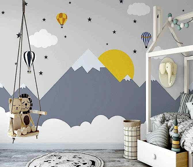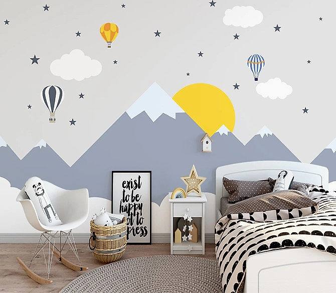 Çocuk Duvar Kağıdı Gün Batımı Balonlar Karlı Dağ Bulutlar Yıldızlar Duvar Kağıdı
