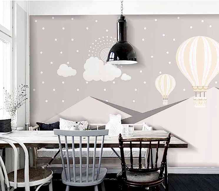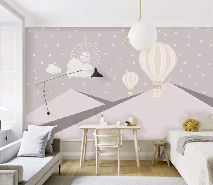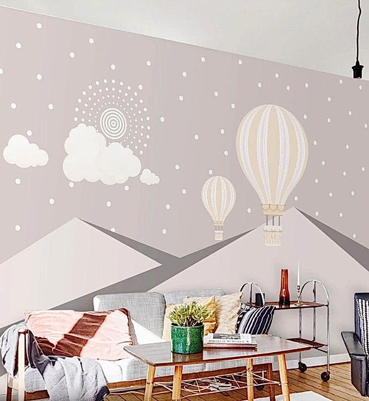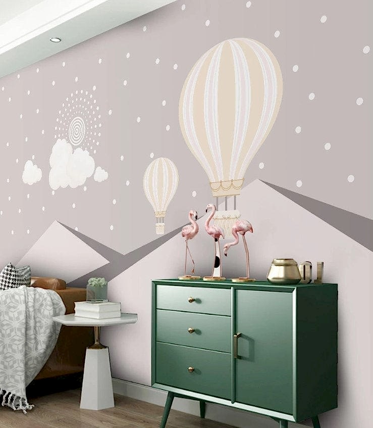 Çocuk Duvar Kağıdı Hava Balonları Pembemsi Dağlar Güneş Bulut Duvar Kağıdı