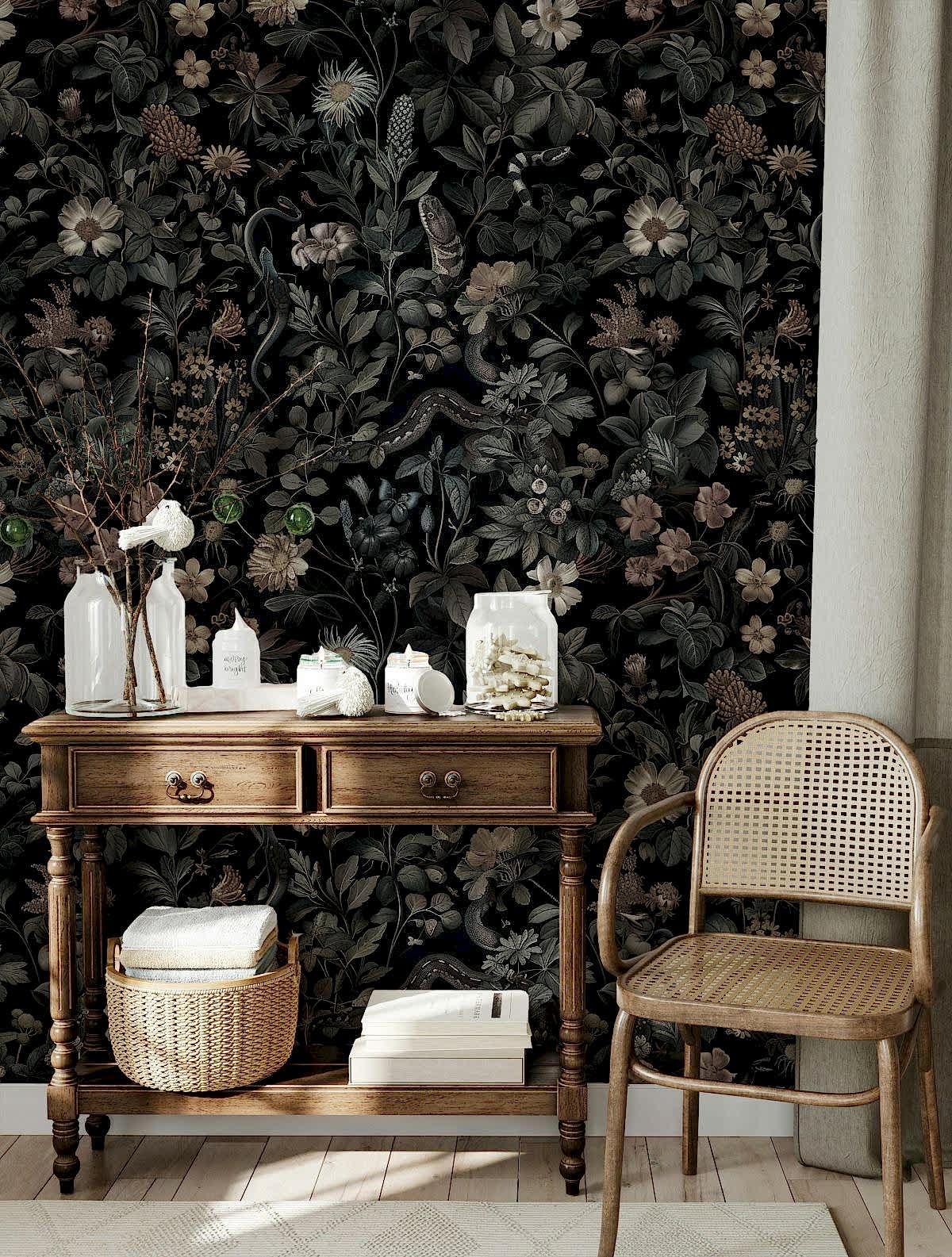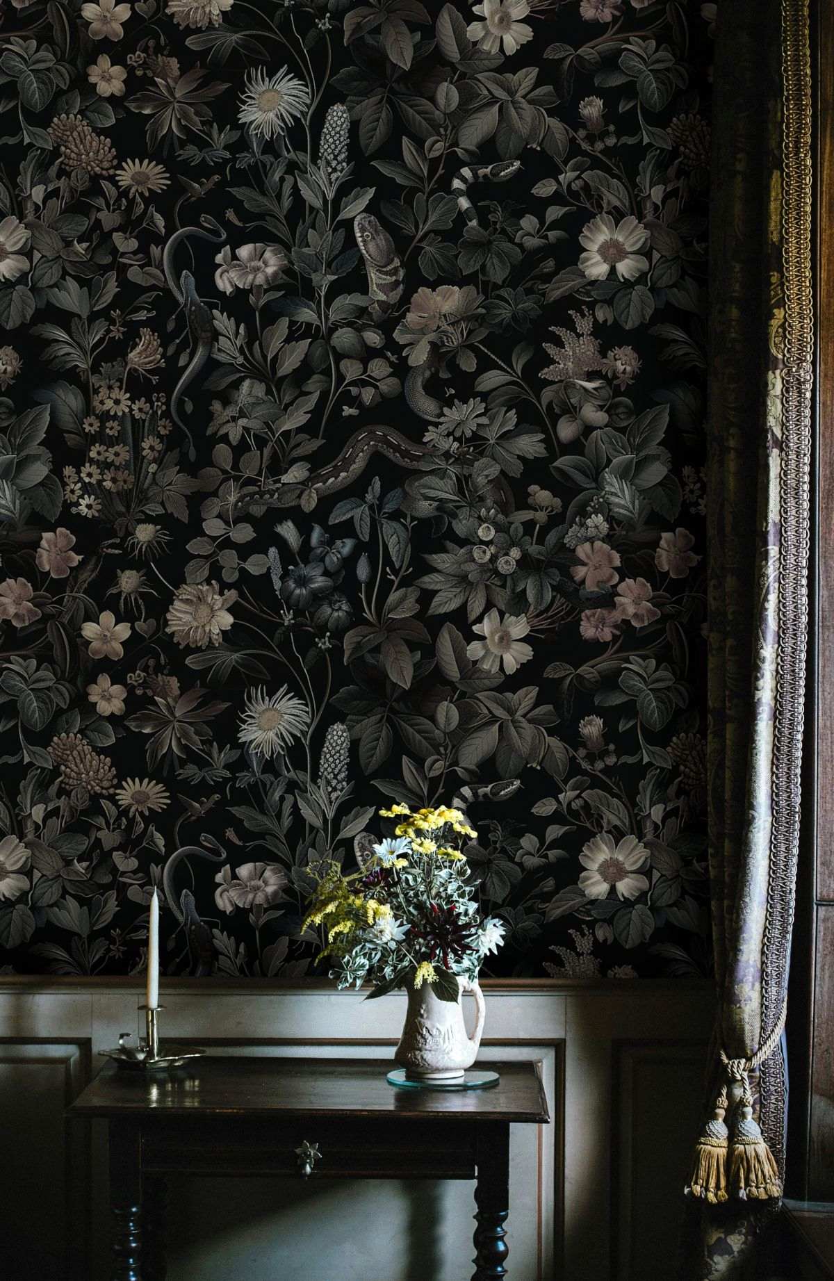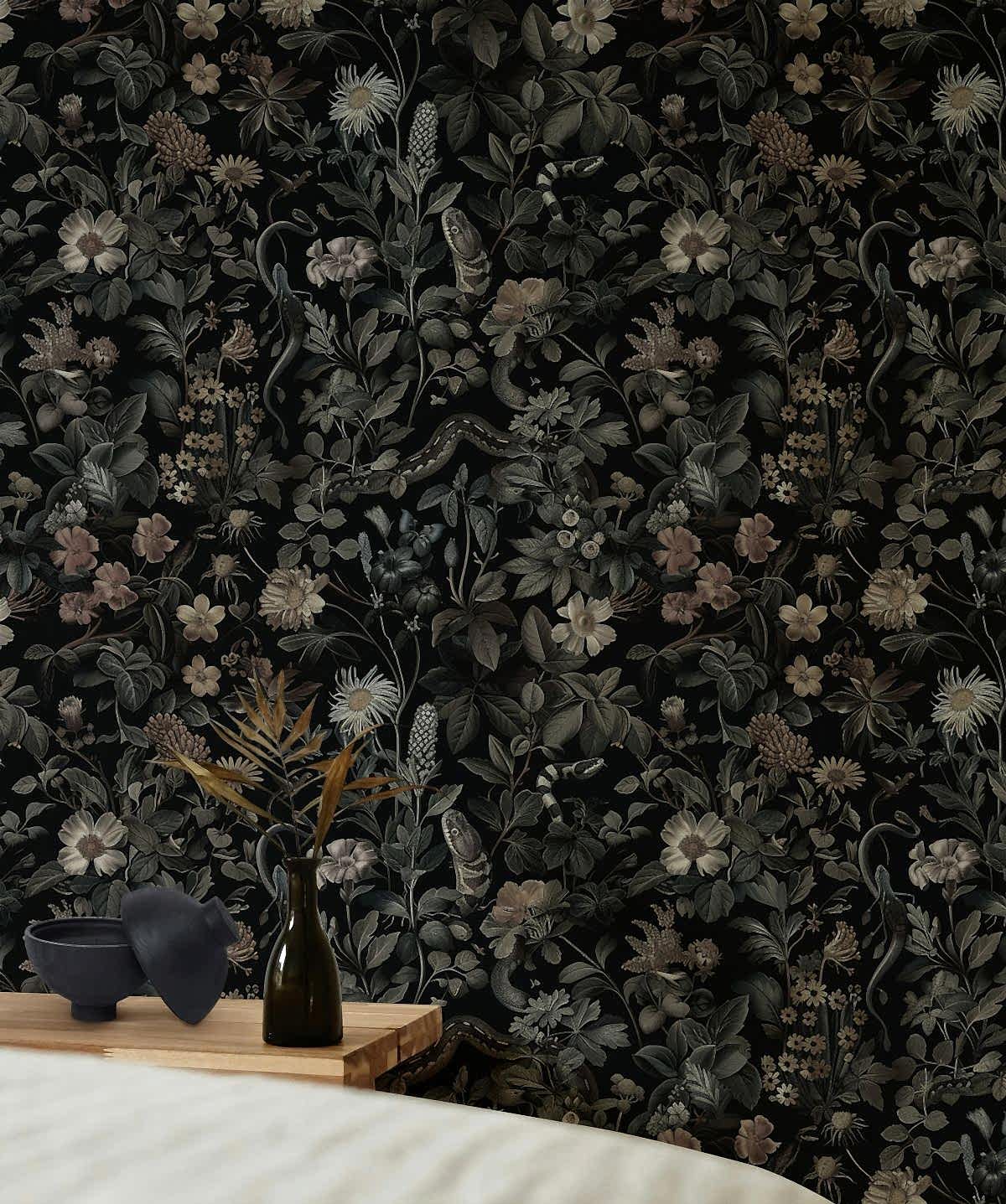 Karanlık ve Koyu Arka Planlı Çiçekli Duvar Kağıdı – Siyah Arka Planda Bitkiler, Çiçekler ve Yılan ile Yoğun ve Aşırı Büyülü Desen