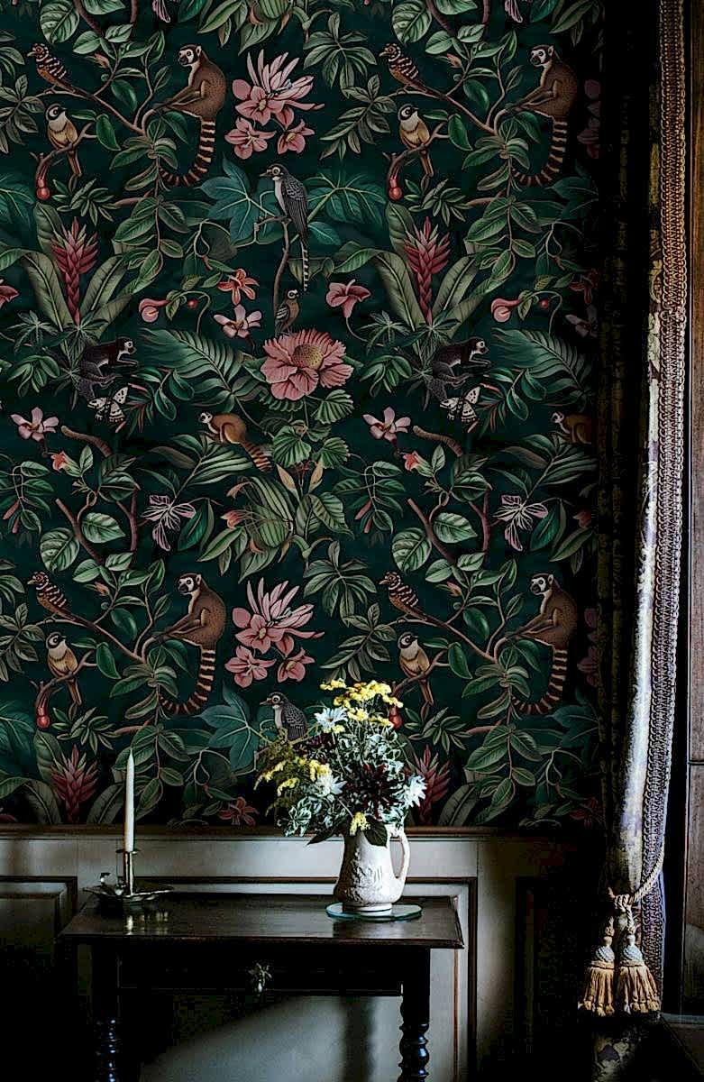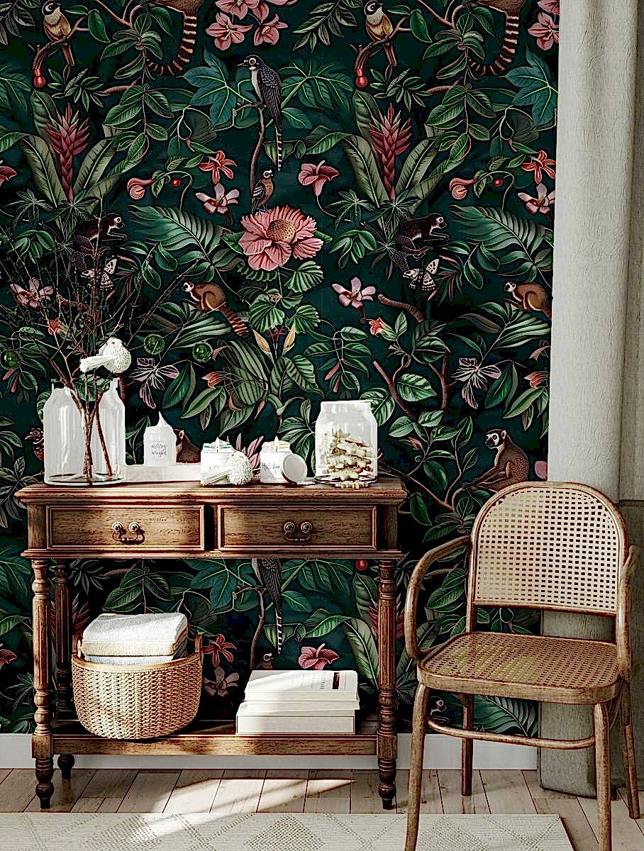 Bu çarpıcı karanlık botanik orman duvar kağıdıyla alanınızı dönüştürün. Zengin, karanlık bir arka plan üzerinde egzotik hayvanlar, yemyeşil tropikal bitkiler, canlı çiçekler ve rengarenk kuşlar içeren karmaşık bir tasarıma sahip bu duvar kağıdı, ormanın güzelliğini ve gizemini evinize getiriyor. Ayrıntılı elle boyanmış stil, lüks ve sanatsal bir dokunuş katarak cesur ve iddialı bir duvar oluşturmak için mükemmeldir. Oturma odaları, yatak odaları veya doğanın vahşi güzelliği ile sofistike tasarımın bir karışımını arayan herhangi bir alan için idealdir. Derin, koyu tonlar, flora ve faunanın canlı renkleriyle birleşerek büyüleyici ve gösterişli bir atmosfer yaratıyor.