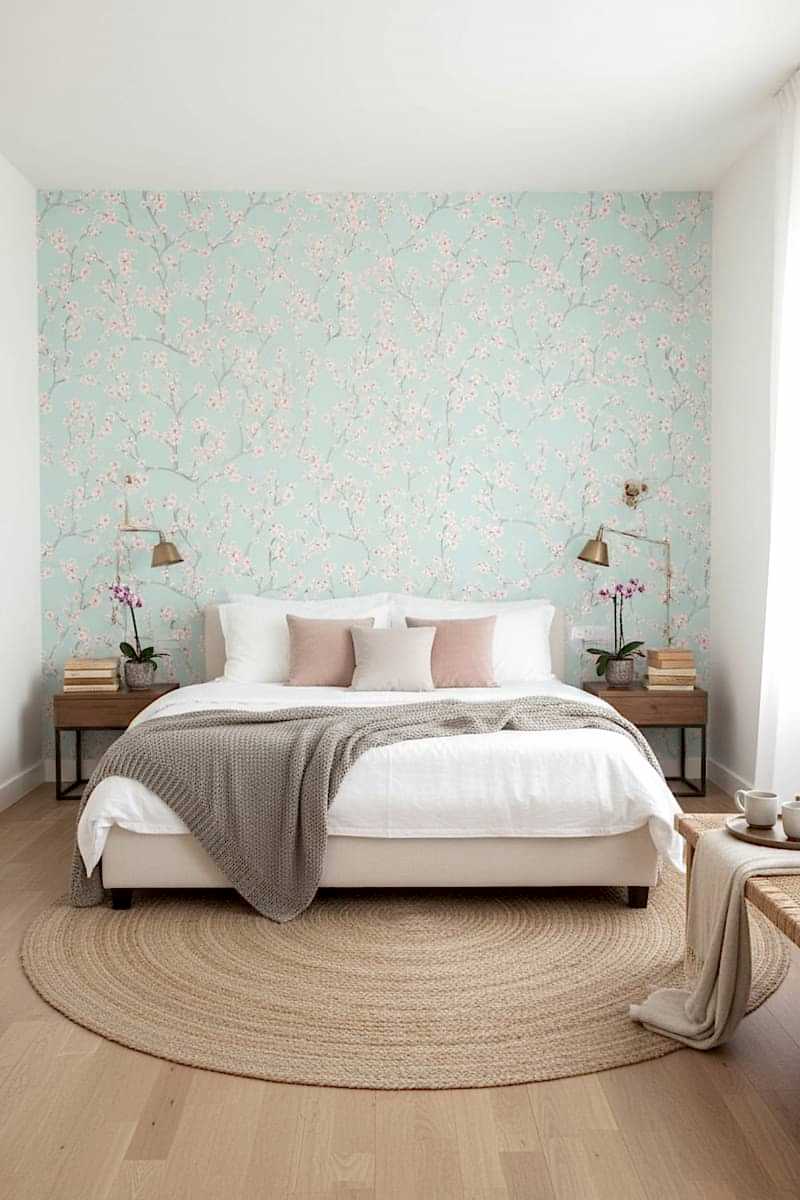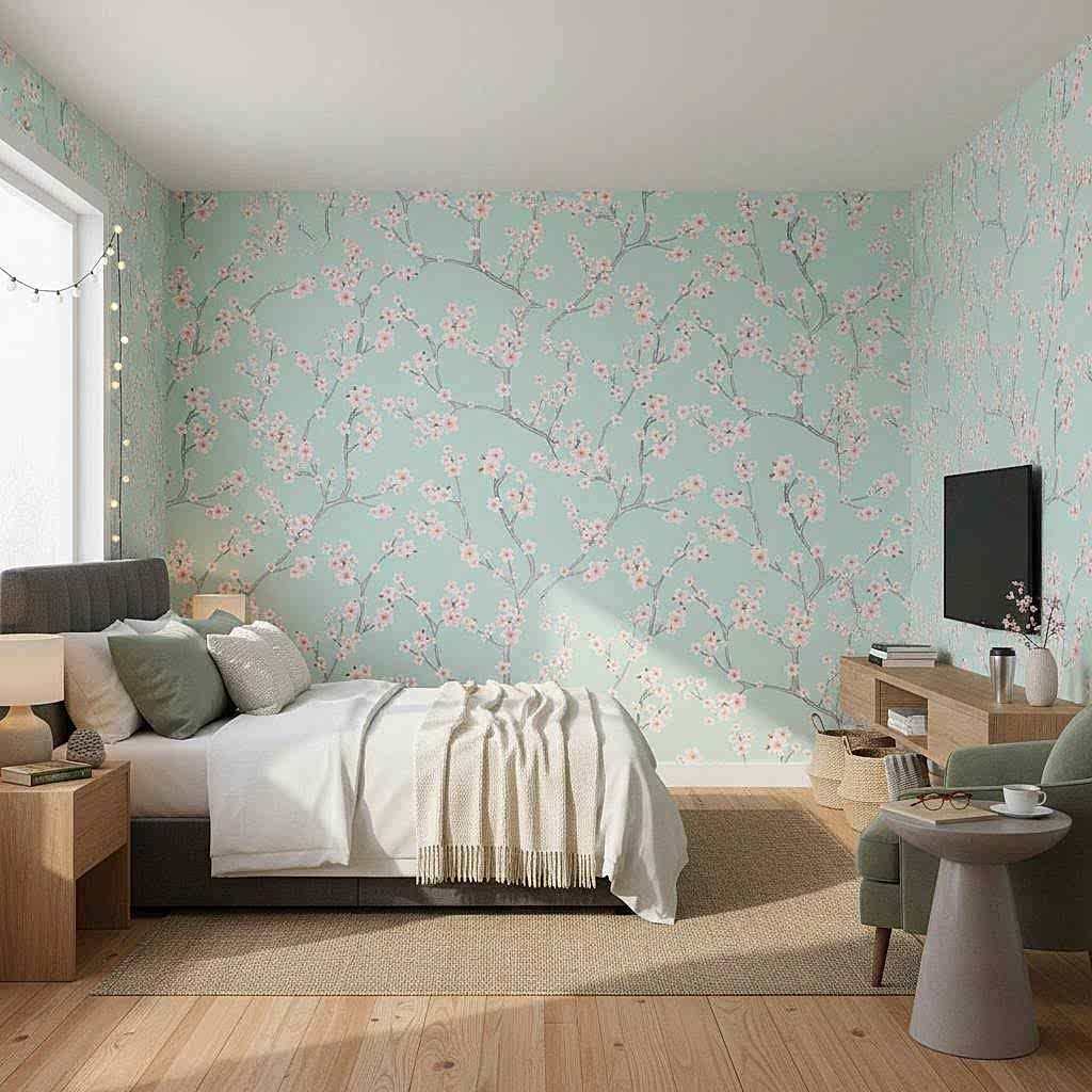 Bu duvar kağıdı, pembe çiçekler ve açık yeşil dallarla bezenmiştir. Gri arka plan üzerine serpiştirilmiş bu detaylar, mekanınıza huzurlu bir atmosfer katıyor. Modern ev dekorasyonu için ideal bir seçim.