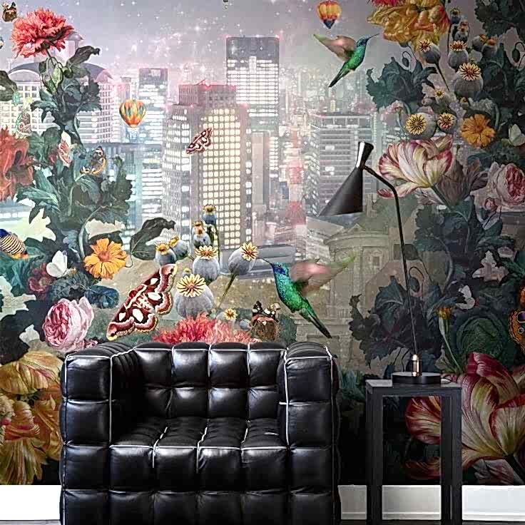 Renkli Çiçekler Arasında Görünen Gökdelen Şehir Desenli Duvar Kağıdı