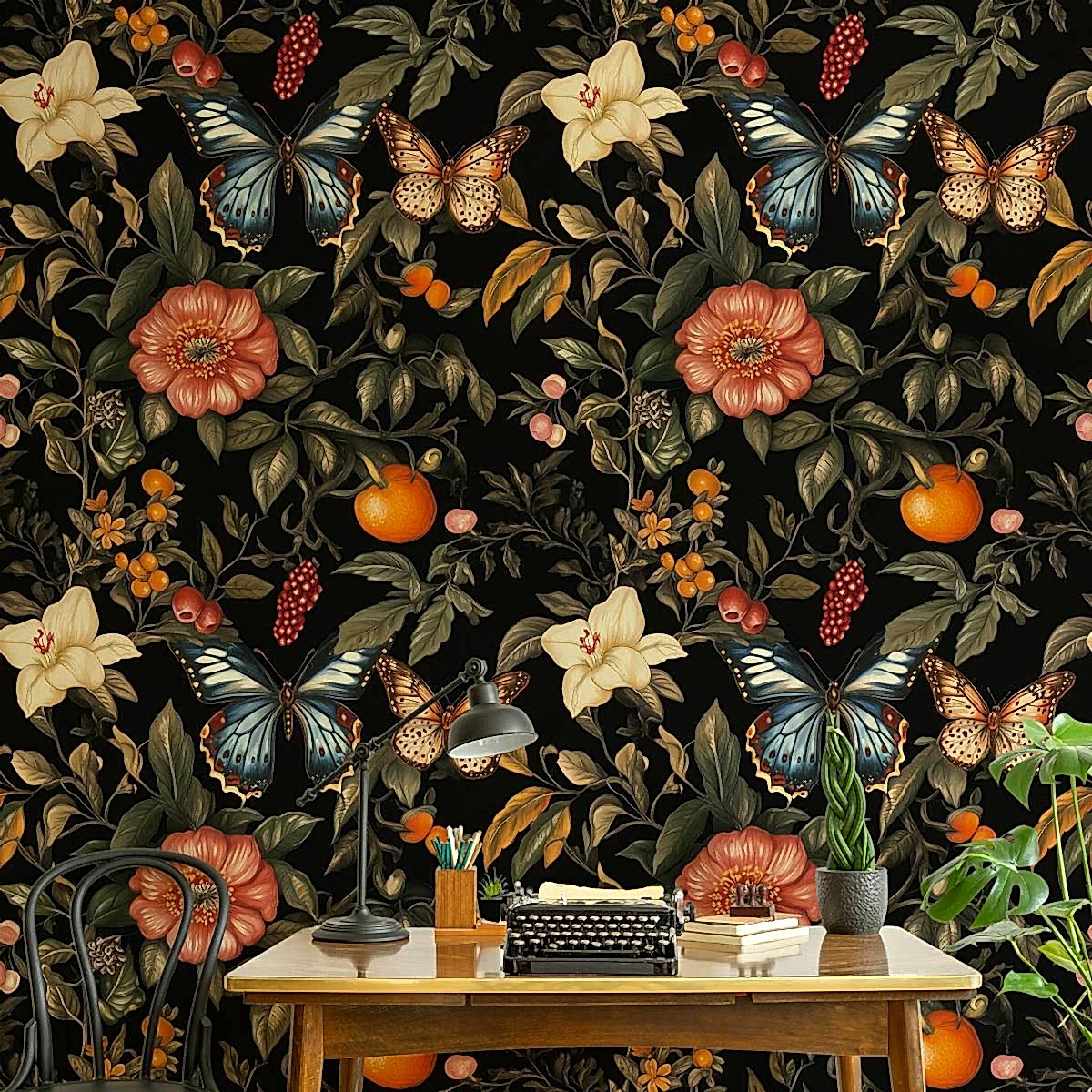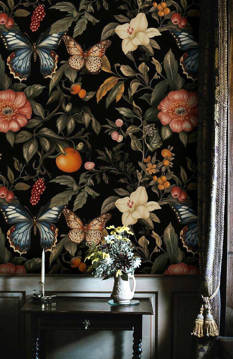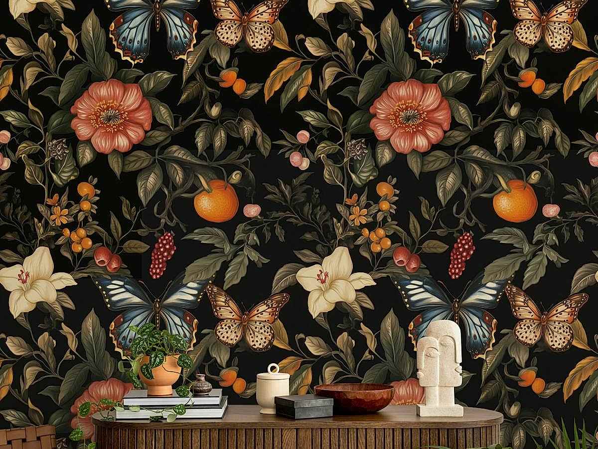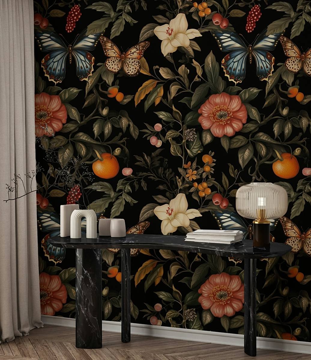 Tropikal Bahar, egzotik çiçekler, kelebekler ve meyve dallarının zarif bir uyumla harmanlandığı göz alıcı bir tasarım sunar. Siyah zemin üzerindeki detaylı illüstrasyonlar, doğanın gizemli ve canlı güzelliğini modern mekanlara taşıyor. Zarif kelebeklerin hareket kattığı bu tasarım, çalışma odalarından oturma odalarına kadar her alana şıklık ve tazelik getirir. Doğayı evinizde hissetmek için mükemmel bir seçim!