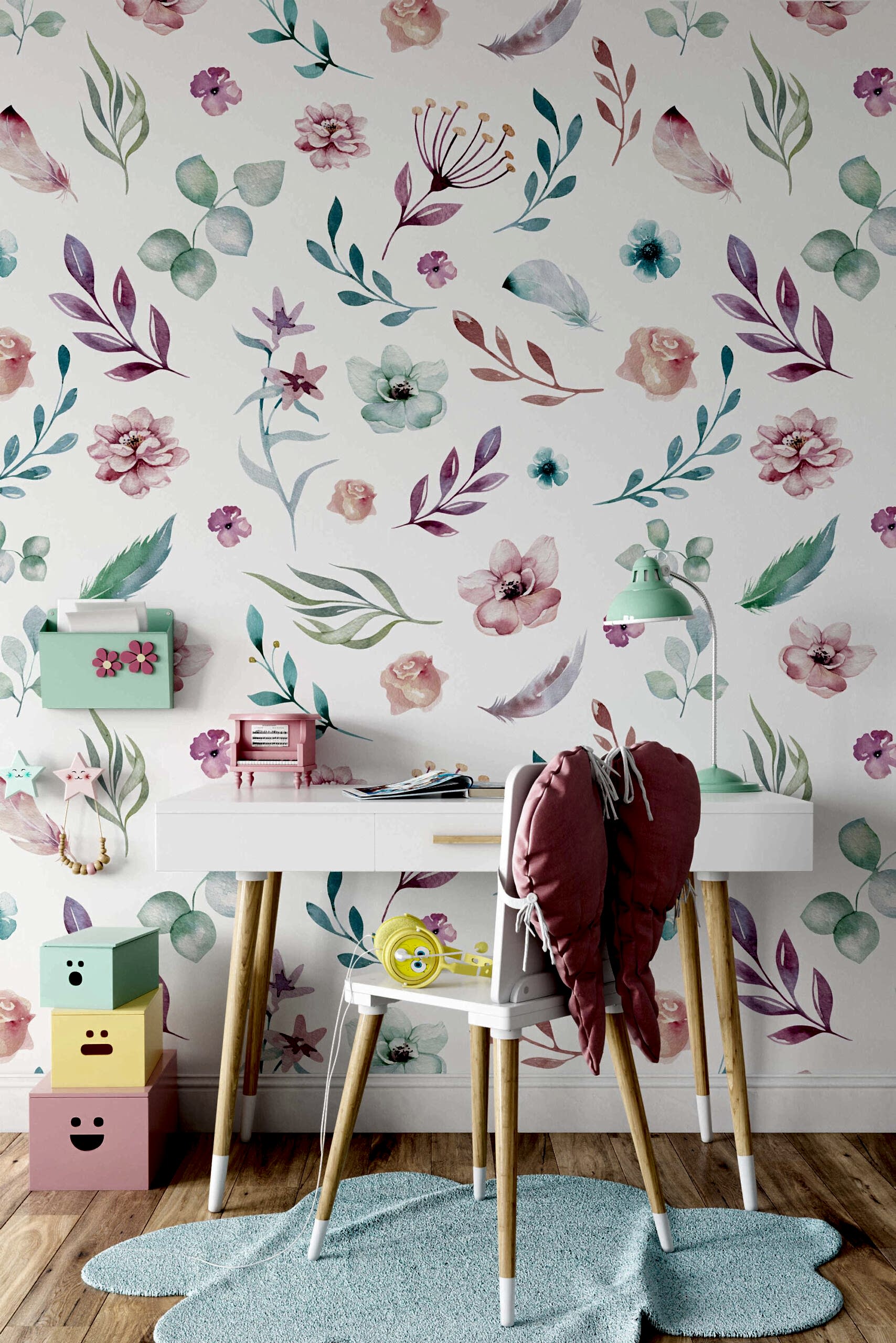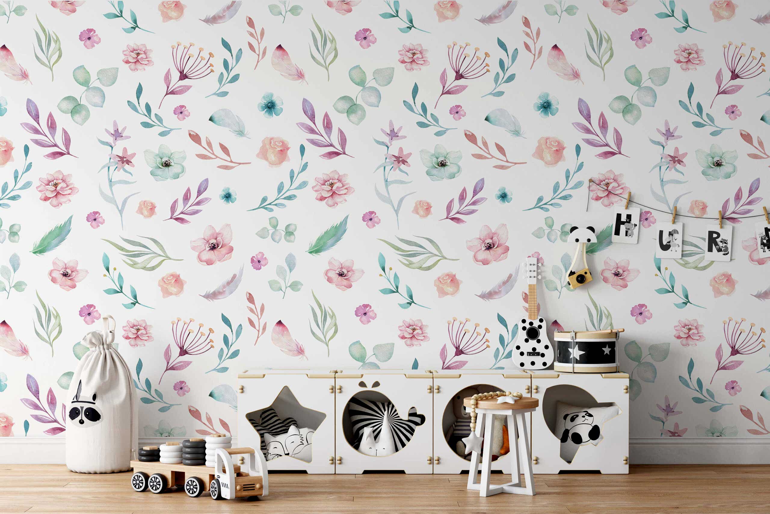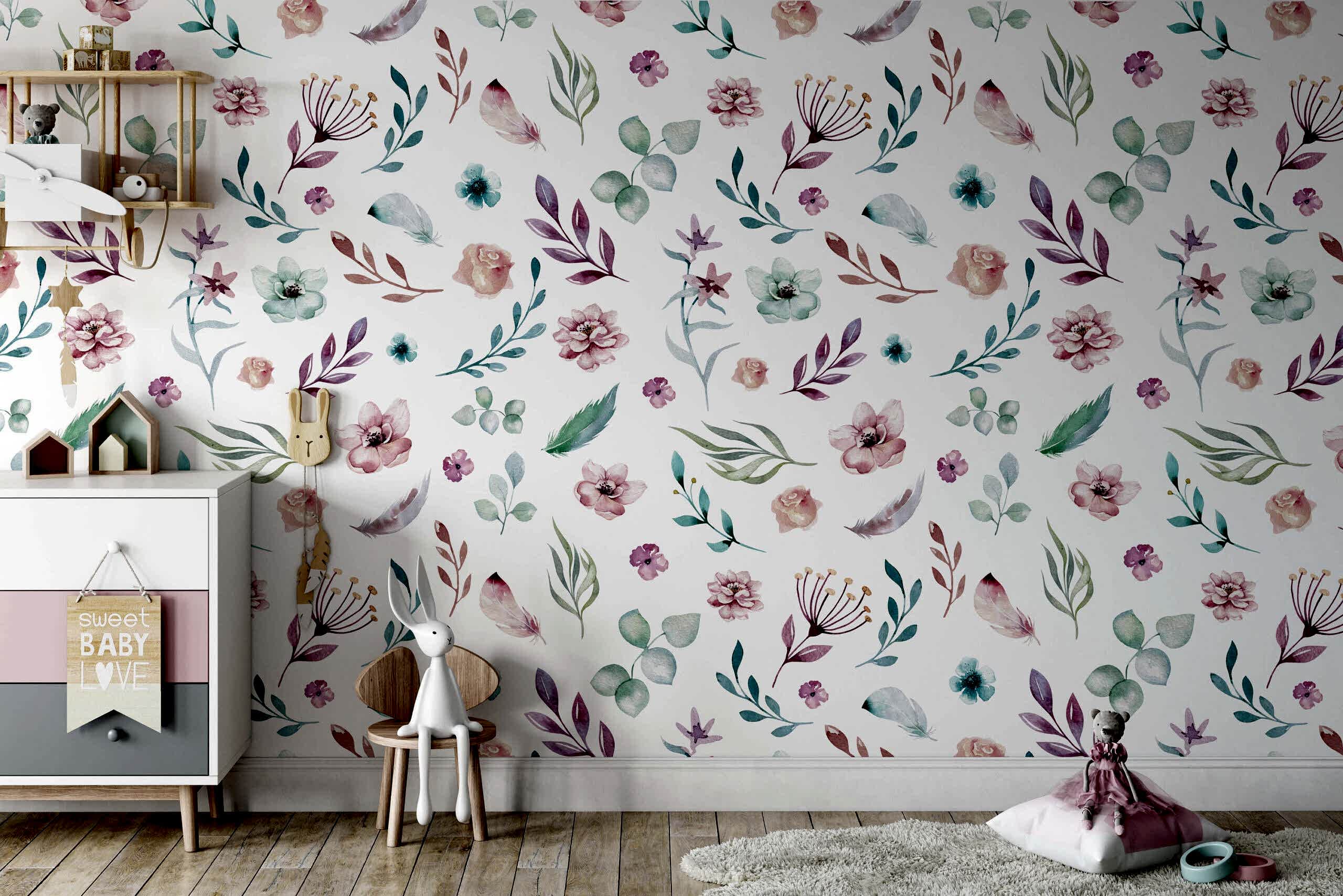 Çocuk Duvar Kağıdı Suluboya Renkli Desen Çiçekler Çiçekli Duvar Kağıdı