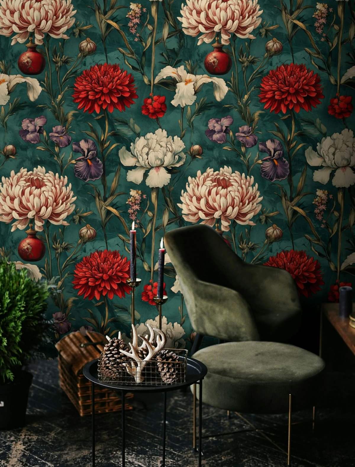Bu vintage botanik duvar kağıdı, zarif kırmızı ve beyaz çiçeklerin göz alıcı bir kombinasyonuyla bezenmiştir. Zengin, koyu teal arka plan üzerinde öne çıkan büyük çiçek motifleri, hem klasik hem de modern dekorasyon stillerine uyum sağlar. Ev veya ofis alanlarınıza doğal bir dokunuş katarak, sıcak ve davetkar bir atmosfer yaratır. Desenin detaylı işçiliği ve kaliteli baskı teknikleri ile mekanınıza sanatsal bir hava kazandırın. Bu eşsiz tasarım, her türlü iç mekana sofistike bir bahçe estetiği getirir.
