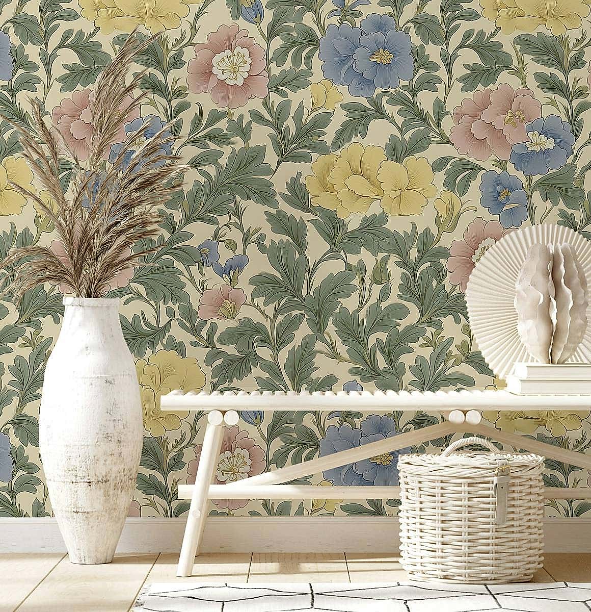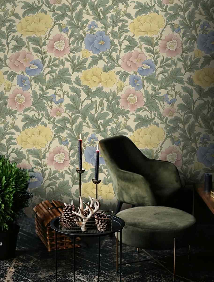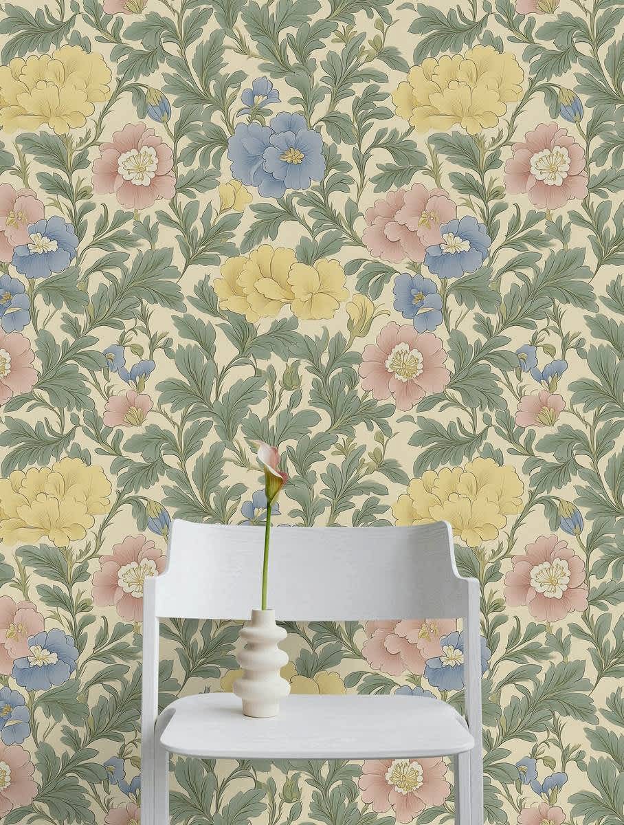 Vintage Botanik Zarafet Duvar Kağıdımızın zamansız cazibesiyle mekanınızı dönüştürün. Bu zarif duvar resmi, rahatlatıcı krem rengi bir arka plana karşı sarı, mavi ve pembe tonlarında yumuşak pastel çiçeklerden oluşan narin bir diziyi içeriyor. Yemyeşil yapraklar çiçeklerle iç içe geçerek klasik botanik çizimlerin zarafetini çağrıştıran uyumlu ve doğal bir desen yaratıyor. Yumuşak renk paleti ve karmaşık çiçek desenleri, bu duvar kağıdını yatak odalarında, oturma odalarında veya yemek alanlarında dingin ve sofistike bir atmosfer yaratmak için mükemmel hale getiriyor. Geleneksel İngiliz bahçe motiflerinden ilham alan bu duvar kağıdı, her türlü iç mekana vintage romantizm ve rafine zarafet katarak hem klasik hem de çağdaş dekor stilleriyle kusursuz bir şekilde harmanlanıyor.