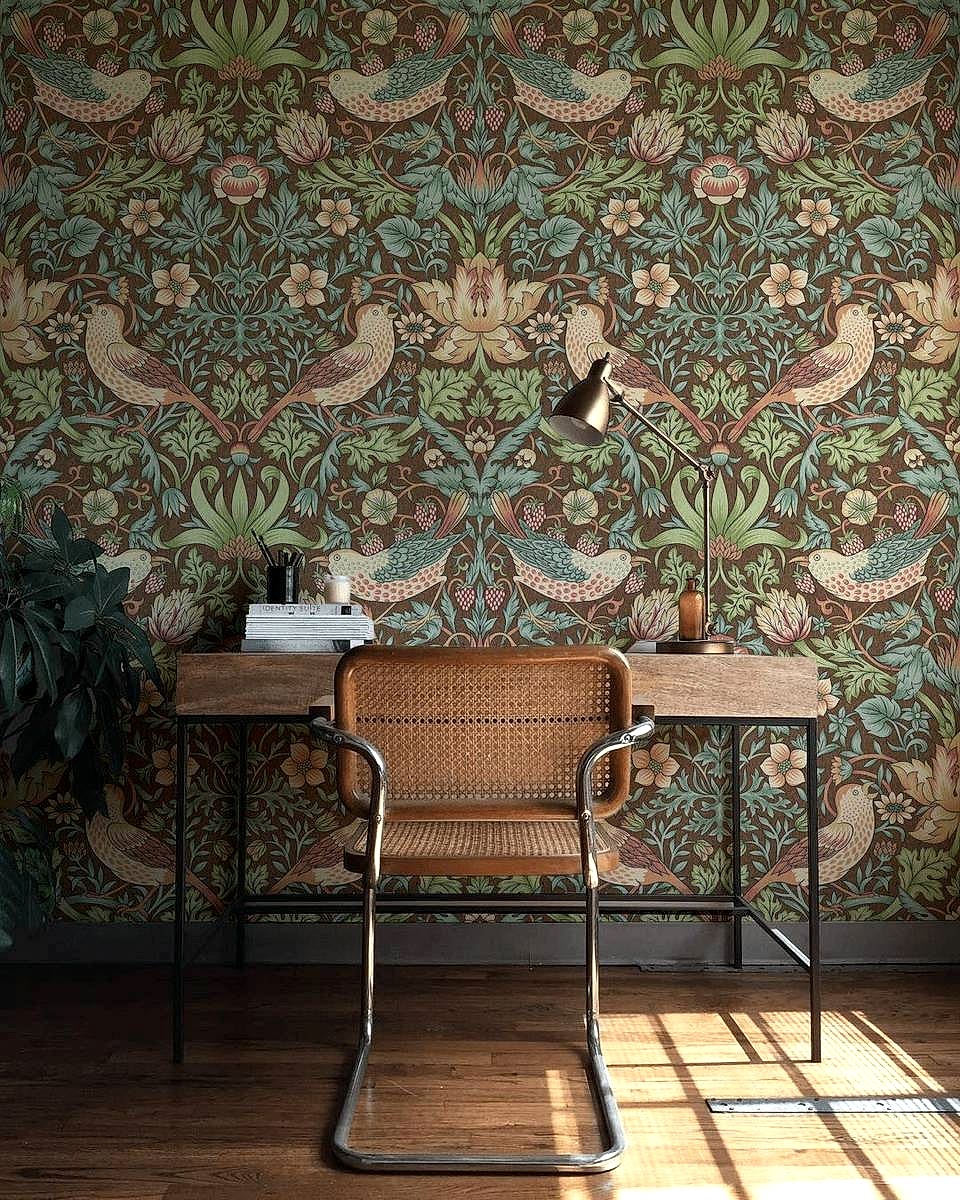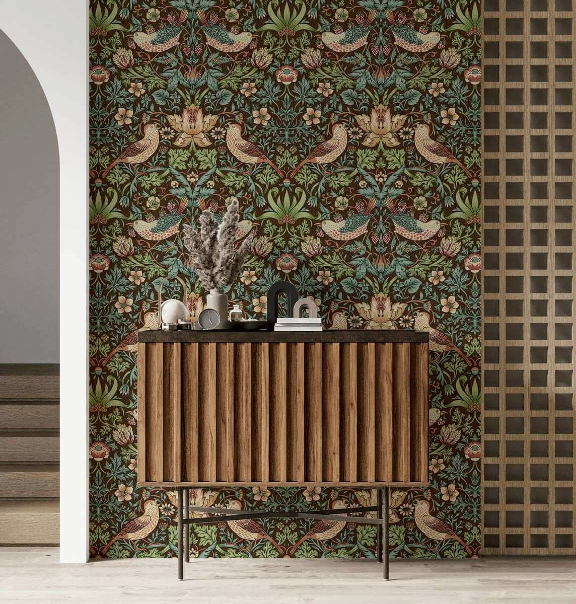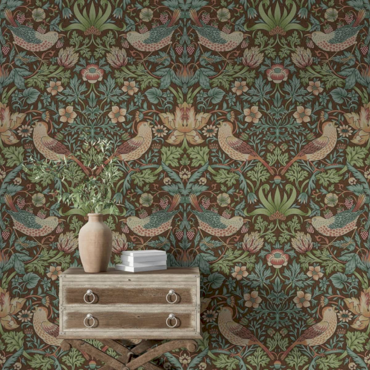 Bu geleneksel duvar kağıdı, yeşil, kahverengi ve krem tonlarında bahçe kuşları, çilekler ve çiçek yapraklarından oluşan botanik bir sahne sunar. Strawberry Thief tasarımı, doğadan ilham alan detayları ve Viktorya dönemi tarzını birleştirir. William Morris’in zanaatkâr ruhunu yansıtan klasik bir mural atmosferi yaratmak için idealdir.