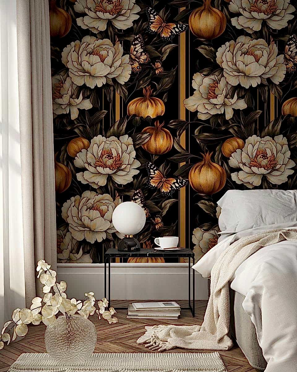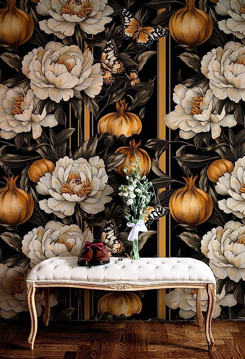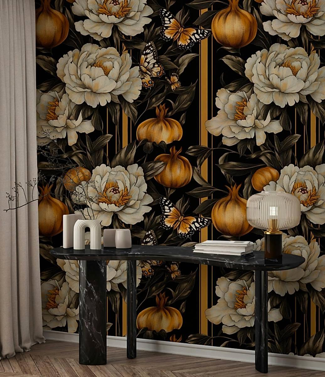 Altın renkli narlar ve narin kelebeklerle lüks çiçek tasarımına sahip bu çarpıcı Art Deco esintili duvar kağıdıyla evinizin dekorunu yükseltin. Cesur siyah bir arka plan üzerinde yer alan çiçeklerin ve yaprakların karmaşık detayları, her mekana vintage bir zarafet dokunuşu getiriyor. Dramatik vurgulu bir duvar oluşturmak için mükemmel olan bu soyulabilir ve yapıştırılabilir duvar kağıdı, iç mekanlarına zamansız bir incelik ve bir miktar cazibe katmak isteyenler için idealdir. Oturma odası, yatak odası veya yemek alanı için bu duvar kağıdının dekorunuza zengin ve gösterişli bir his katacağından emin olabilirsiniz.