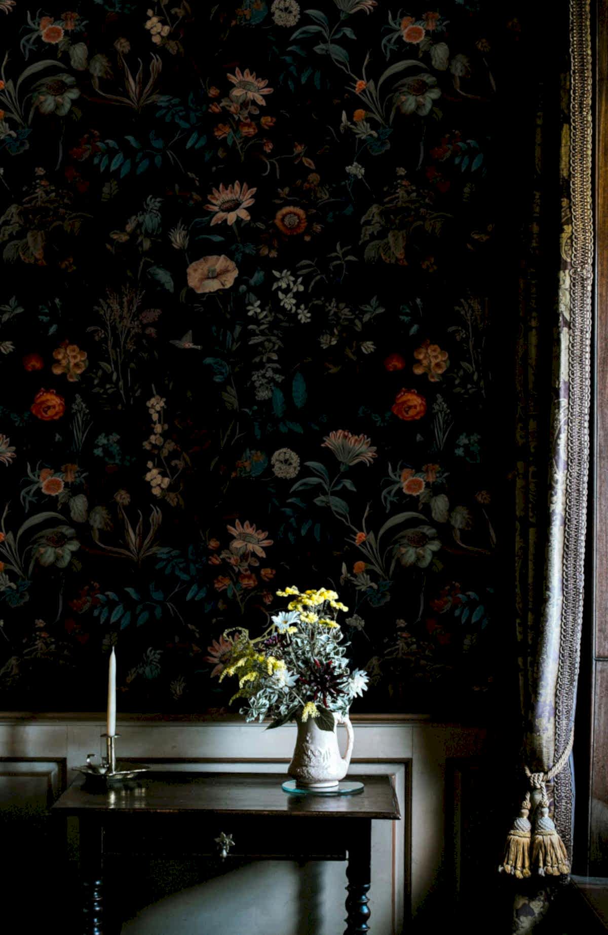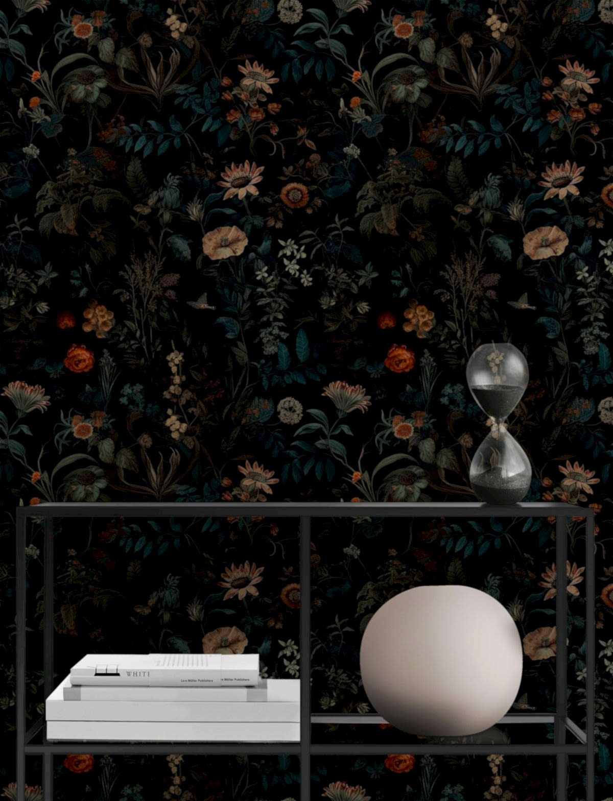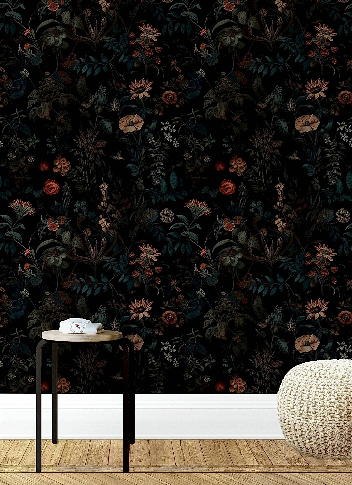 Bu karanlık, koyu çiçekli duvar kağıdının gizemli çekiciliğine kendinizi kaptırın. Siyah bir arka plan üzerine yerleştirilmiş çeşitli bitkiler, çiçekler ve bir yılan içeren yoğun, aşırı büyümüş deseni ile bu tasarım, merak ve sofistike bir hava uyandırır. Flora ve faunanın gerçekçi detaylandırılması, büyüleyici ve dramatik bir atmosfer yaratır ve benzersiz ve sanatsal dekoru takdir edenler için mükemmeldir.